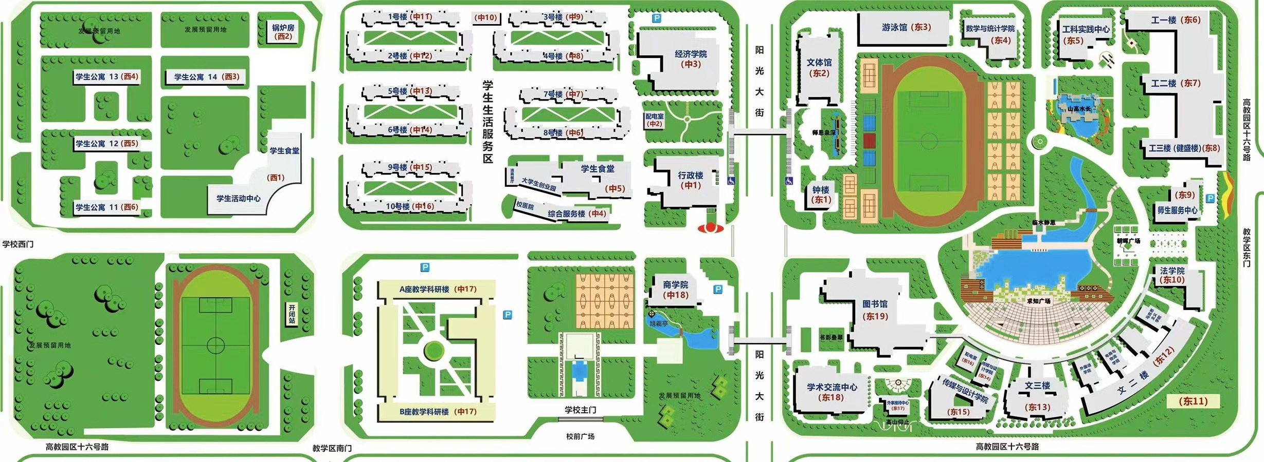 游泳館(東3)、文體館(東2)、圖書館(東19)、鐘樓(東1)、配電室(東16、中2)、鍋爐房(西2)因功能性強,保留原有名稱,不做修改。
