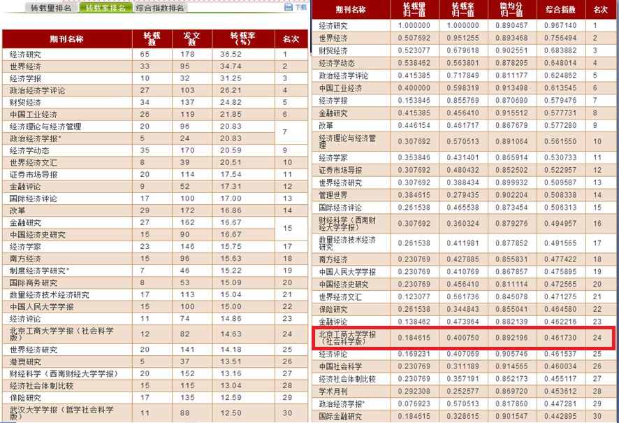 《北京工商大學學報(社會科學版)》2016年度轉載量為14篇,在全國各類高等院校主辦的1150種學報中排名第48位,在包括《中國社會科學》《經濟研究》《管理世界》等權威期刊在內的503種經濟類期刊中排名第29位,首次躋身于該類排名的前30位;轉載率為17.07%,在1150種高校學報中排名第30位,在503種經濟類期刊中排名第24位。