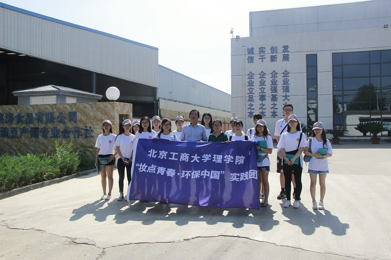 在北京味食源有限公司,實踐團成員在公司負責人帶領下,參觀了生產車間和研發中心,對食品香精香料的生產工藝流程進行了初步了解。在參觀過程中,同學們深刻感受到了自動化生產帶來的高效率,同時,結合本次實踐環保主題,對生產過程中的廢水、廢氣、廢料處理和回收等問題展開了積極討論學習。