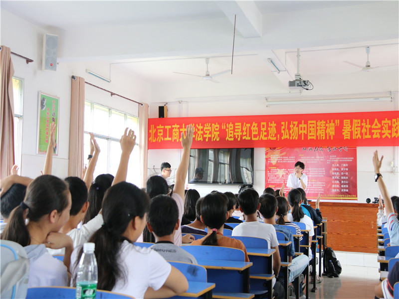普法調(diào)研核心價值觀。初入桂林,團(tuán)員們在枧塘中學(xué)許下誓言,此行定當(dāng)不負(fù)眾望,弘揚(yáng)中國精神,傳播中國價值。在給枧塘中學(xué)的同學(xué)們宣揚(yáng)中國精神,普及法律知識的過程中,團(tuán)員們不僅鍛煉了自己,也增進(jìn)了對當(dāng)?shù)厍闆r的了解。通過走訪全州縣龍達(dá)鐵合金有限公司,團(tuán)員們更加深刻的體悟了工匠精神。而針對革命老區(qū)的法律普及調(diào)研活動也于此正式展開。團(tuán)員們還結(jié)合當(dāng)?shù)氐膶?shí)際情況,以當(dāng)?shù)乇崋T雇傭合同為例,為村民們普及相關(guān)知識,真正做到了學(xué)以致用。