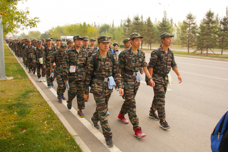 越野拉練是軍訓(xùn)的重要科目,25日一早,在鮮紅的團(tuán)旗帶領(lǐng)下,軍訓(xùn)團(tuán)開始了8公里的徒步急行軍。前后近3個(gè)小時(shí)的行軍途中,16個(gè)連隊(duì)一路高歌,教官和指揮部領(lǐng)導(dǎo)老師、帶隊(duì)輔導(dǎo)員全程陪伴,中途還進(jìn)行了防空襲、通過染毒地帶的科目演練。
