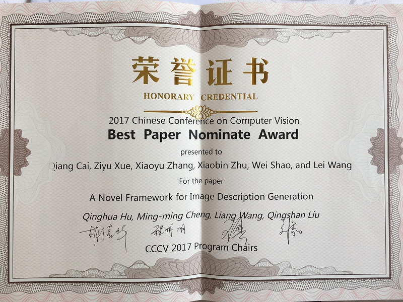 10月12日,中國計算機視覺大會(The Chinese Conference on Computer Vision,CCCV2017)在天津舉行,大會由中國民航大學承辦,天津大學和南開大學聯合協辦,1000多名嘉賓參會。我校計信學院研究生撰寫的兩篇論文被會議收錄并參加口頭報告環節,其中一篇獲評優秀論文。