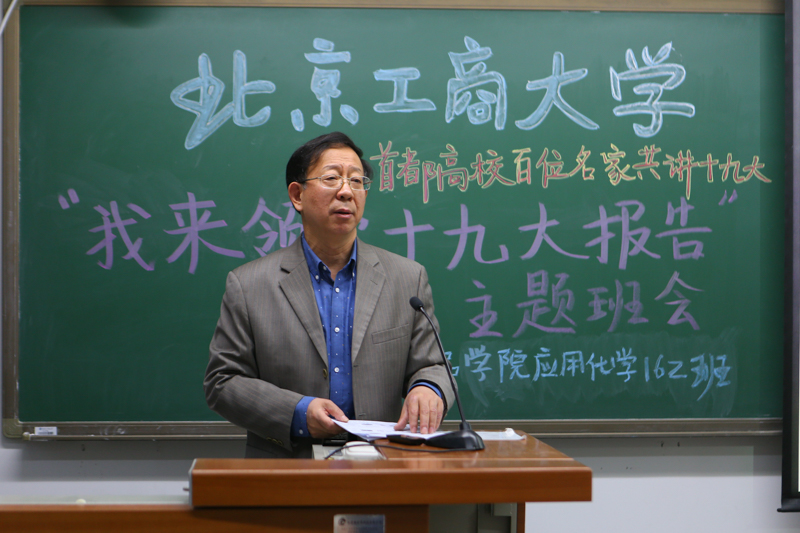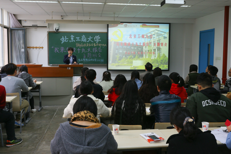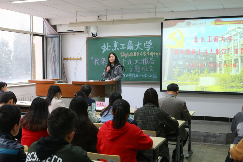 主題班會的一大特色是邀請學校、學院領導走入班級,與學生一起開班會讀報告。本次班會邀請到的是校長孫寶國院士,他在同學們分別領讀報告后,以微黨課的形式與大家分享他自己學習十九大報告的感想。孫校長從同學們所學的應用化學專業實際出發,結合自己在食品和白酒領域的專業研究,從我國社會主要矛盾轉化與我們的使命 、食品安全永遠在路上 、習近平總書記非常關心食品產業的發展三方面,為同學們解讀了十九大精神學習應把握的重點,向同學們提出“以實際行動貫徹落實十九大精神”的要求。