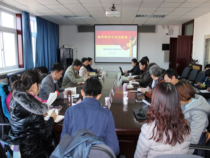 11月14日下午,計算機與信息工程學院召開集體學習十九大報告專題會。副校長方德英、學院領導班子成員、各教工黨支部書記、各系(中心)主任、各民主黨派代表、教職工代表36人參加會議。會議由學院黨委書記陳誼主持。