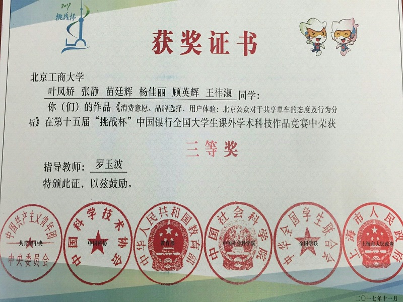 1114日至18日,由共青團中央、中國科協、教育部、中國社會科學院、全國學聯和上海市人民政府共同主辦,上海大學承辦的第十五屆挑戰杯全國大學生課外學術科技作品競賽終審決賽舉行。我校經濟類參賽作品《消費意愿、品牌選擇、用戶體驗北京社會公眾對于共享單車的態度及行為分析》進入全國終審決賽。經過作品展示、專家質詢、現場答辯、評委會審議等環節,榮獲全國三等獎。