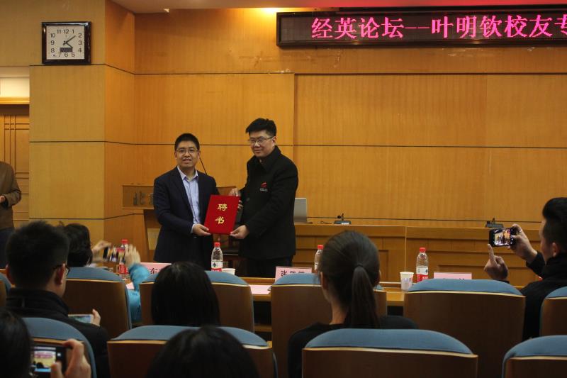 講座開始前,張正平為葉明欽校友頒發(fā)校友導(dǎo)師聘書。