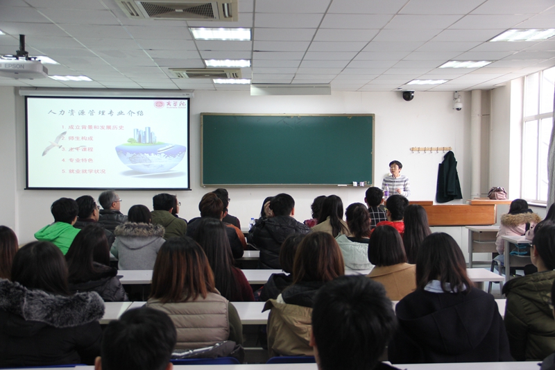 商學院人力資源管理系何輝老師向同學們簡要介紹了商學院人力資源管理專業的發展背景、課程設置、專業特色、師生構成及就業就學情況。隨后,何老師具體講解了北京地區高校畢業生就業情況及人才培養方案的內容,向同學們展示了學校經管類專業融入創新創業的教育理念、加強創新創業實踐基地的建設、重視校企合作、實施各種創新創業訓練項目等內容。