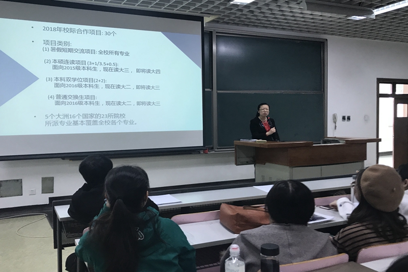 國際交流與合作處處長劉影對我校2018年學生派出項目的具體內容進行了介紹,詳細講解了每個項目學校情況、項目要求,向同學們明確了申請材料要求、申請條件以及申請流程和各個時間節點,并鼓勵有意向參加我校自費公派出國本科項目的同學們早做準備,合理規劃,選擇適合自己的出國項目。