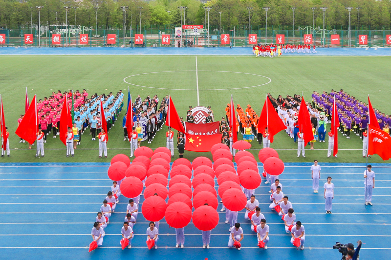 經(jīng)濟學(xué)院方隊以“一帶一路”為主題,結(jié)合紅綢、黃扇、民族舞,展示人類命運共同體的寓意;商學(xué)院方隊以紅色為“激情”,以黃色為“奮斗”,飛舞的綢帶,靈動的劍法譜寫著他們對于夢想的赤忱之心;法學(xué)院代表團(tuán)一襲白衣,手握紅傘,剛?cè)岵卣宫F(xiàn)了運動精神與力量之美;外國語學(xué)院紅旗招展,精神抖擻,用整齊劃一的動作與響亮的口號詮釋了新時代下《中國人》的風(fēng)采;藝傳學(xué)院方隊以整齊的步伐、優(yōu)美的舞姿、良好的精神面貌證明他們必勝的勇氣和力量;馬克思主義學(xué)院方隊由研究生代表組成,他們不僅有嚴(yán)謹(jǐn)求實的學(xué)術(shù)研究,更有馳騁賽道的勇氣。