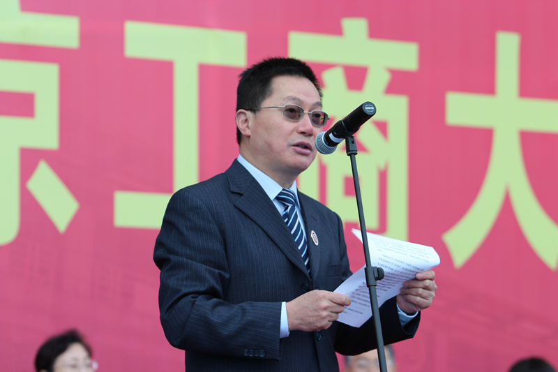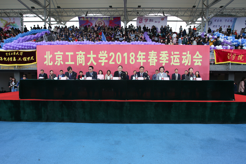 學(xué)校黨委書記譚向勇宣布“北京工商大學(xué)2018年春季運動會”正式開始,并為運動員們打響發(fā)令槍。