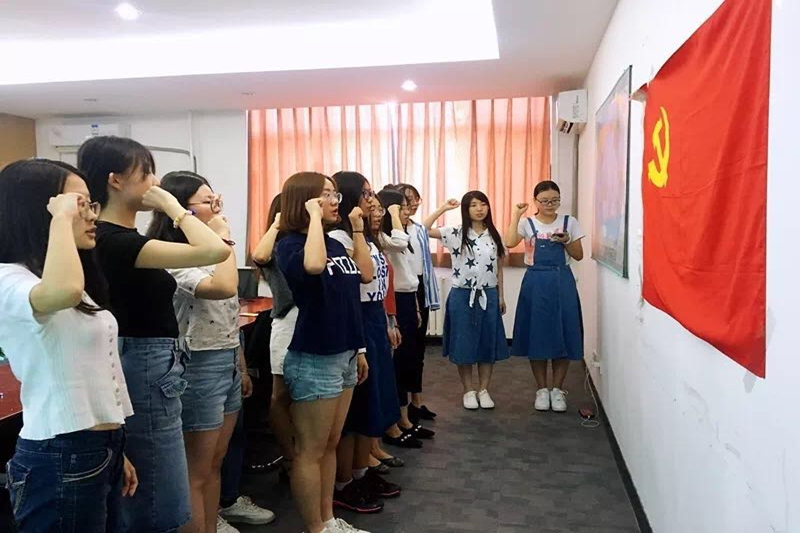 外國語學院則組織了黨員畢業生重溫入黨誓詞,集體宣誓的活動。本科生黨支部書記、優秀退伍學生韓琛,今年考入清華大學讀研深造。她帶領全體畢業生黨員進行了宣誓。鏗鏘有力的誓言,激蕩著工商學子,火紅的黨旗,指引著畢業生黨員。