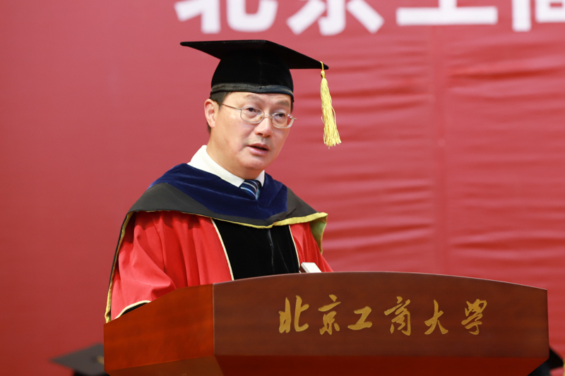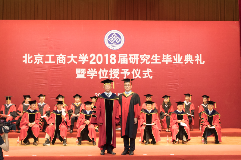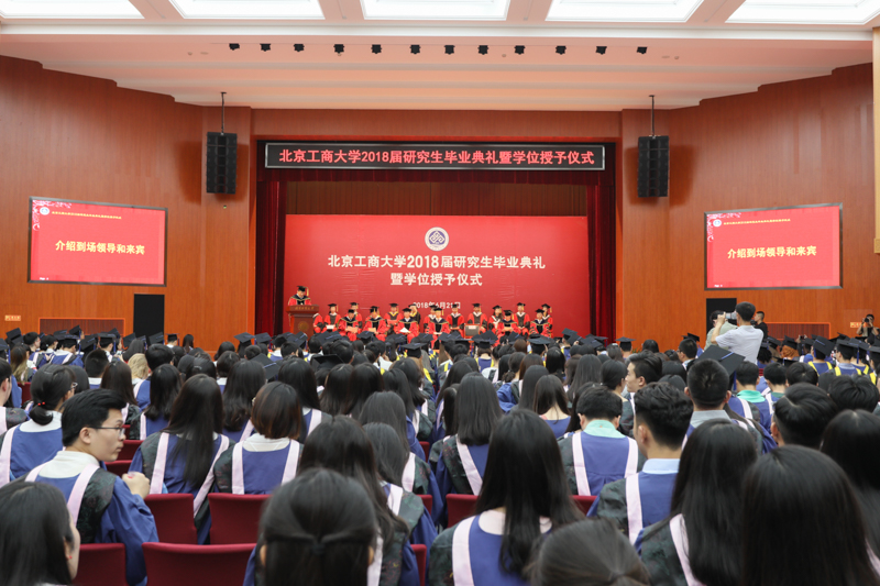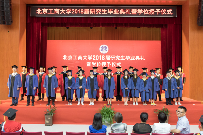 在雄壯的國(guó)歌聲中,典禮正式開始。副校長(zhǎng)謝志華宣讀《北京工商大學(xué)關(guān)于2018屆研究生準(zhǔn)予畢業(yè)及學(xué)位授予的決定》,副校長(zhǎng)李朝鮮宣讀《北京工商大學(xué)關(guān)于表彰2018屆優(yōu)秀畢業(yè)研究生的決定》。2018年,我校共有3名博士生、926名全日制碩士研究生獲得畢業(yè)證書,共有3名博士研究生被授予博士學(xué)位,945名碩士研究生(含非全日制和同等學(xué)力)被授予碩士學(xué)位;有77名研究生被評(píng)為校級(jí)優(yōu)秀畢業(yè)生,其中38名研究生被推薦為市級(jí)優(yōu)秀畢業(yè)生。