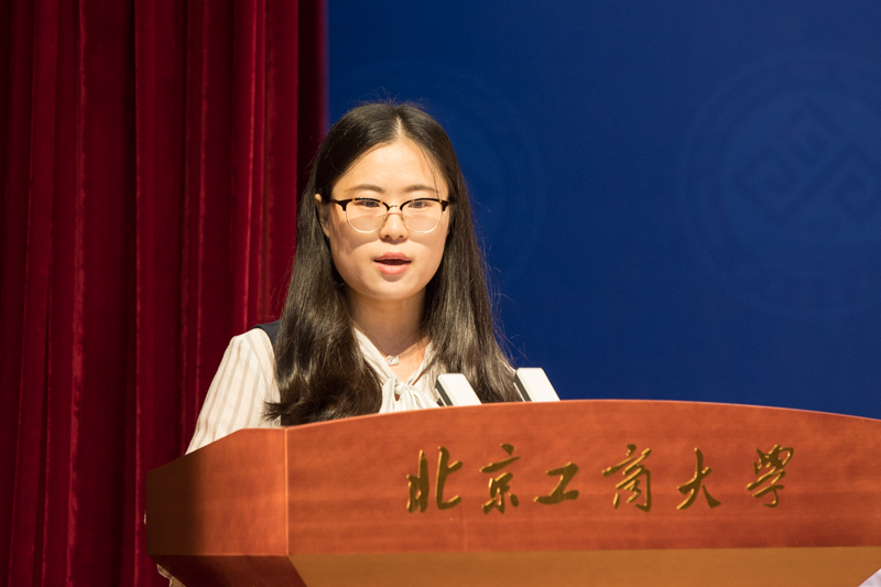 2018級食品學院食品科學與工程專業的博士研究生張敏代表新生發言。她談到,今天大家相聚北工商,內心充滿了新鮮與喜悅,帶著親友的期望和對未來的憧憬,未來將一起奮斗,一起在這片土地上留下我們的篇章。張敏通過關鍵詞“堅持”“勇氣”等與大家分享了學習期間的感悟。她認為,開展科學研究不是一蹴而就的,要慢慢積累不斷堅持;在研究的道路上要抱有成功的信心和勇氣;同時也要堅持崇德立身,努力做到全面發展。張敏談到,她表示,奮斗的青春是最燦爛的,希望大家勇于承擔自己的使命和責任,為實現中國夢貢獻力量,并祝愿所有新生學業有成,向自己的目標勇敢前進。