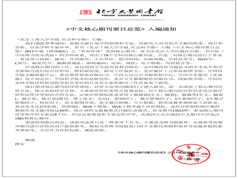 近日,北京大學圖書館《中文核心期刊要目總覽》2017年版編委會通告,我校主辦的《北京工商大學學報(社會科學版)》再次入選《中文核心期刊要目總覽》2017年版(第8版)“貿易經濟”類核心期刊,這是自1992年首次入選以來,我刊連續第8次入選北大核心。