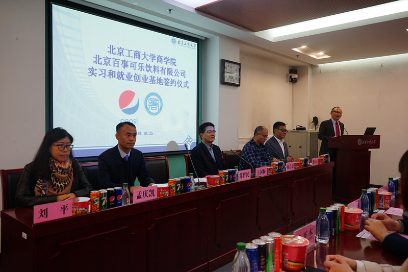 王國順院長在致辭中介紹了商學院辦學歷史與成就,對學院與北京百事可樂飲料公司在人才培養和輸送方面的合作提出了美好愿景。他談到,培養商科人才更需要應社會所需,與市場接軌,注重大學生的在校學習和企業實踐,廣大教師同樣需要加強與企業的交流,開展案例研討和學術科研,達到理論與實踐相結合,貫徹落實立德樹人根本任務。北京百事可樂公司的上級單位康師傅控股公司校企關系總監蘇哲民在講話中表示,作為有社會責任感的企業,應當主動與大學對接,通過校企合作的方式為廣大青年的成長成才設計好通道,也為企業人才儲備打好基礎,并希望能夠與商學院在學術研討、企業管理研究等方面開展更深層次的合作,努力達到大學、企業、學生的“三贏”局面。