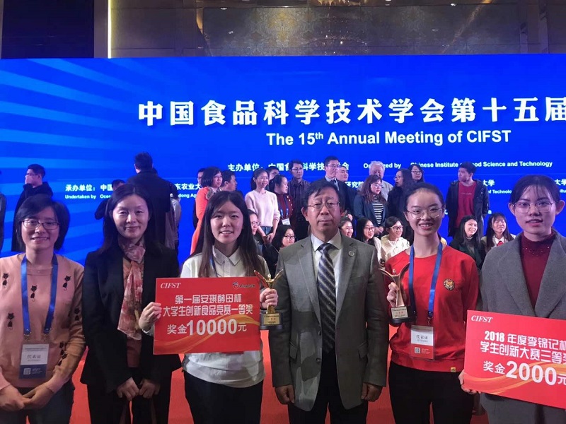 我校食品學(xué)院食品151班李欣萍、付冰冰、劉玉潔、錢瑀的創(chuàng)意作品《養(yǎng)tea-Young Tea》(指導(dǎo)老師:王少甲)獲安琪酵母杯大學(xué)生創(chuàng)新食品競賽全國一等獎,李欣萍同學(xué)作為獲獎代表受邀參加頒獎典禮。食品161朱唯嘉、食品162董驍肖、生物技術(shù)162莫紫香的作品《玫瑰青檸醬》(指導(dǎo)老師:李秀婷、楊然)獲李錦記杯學(xué)生創(chuàng)新大賽全國三等獎,朱唯嘉同學(xué)作為獲獎代表受邀參加頒獎典禮。