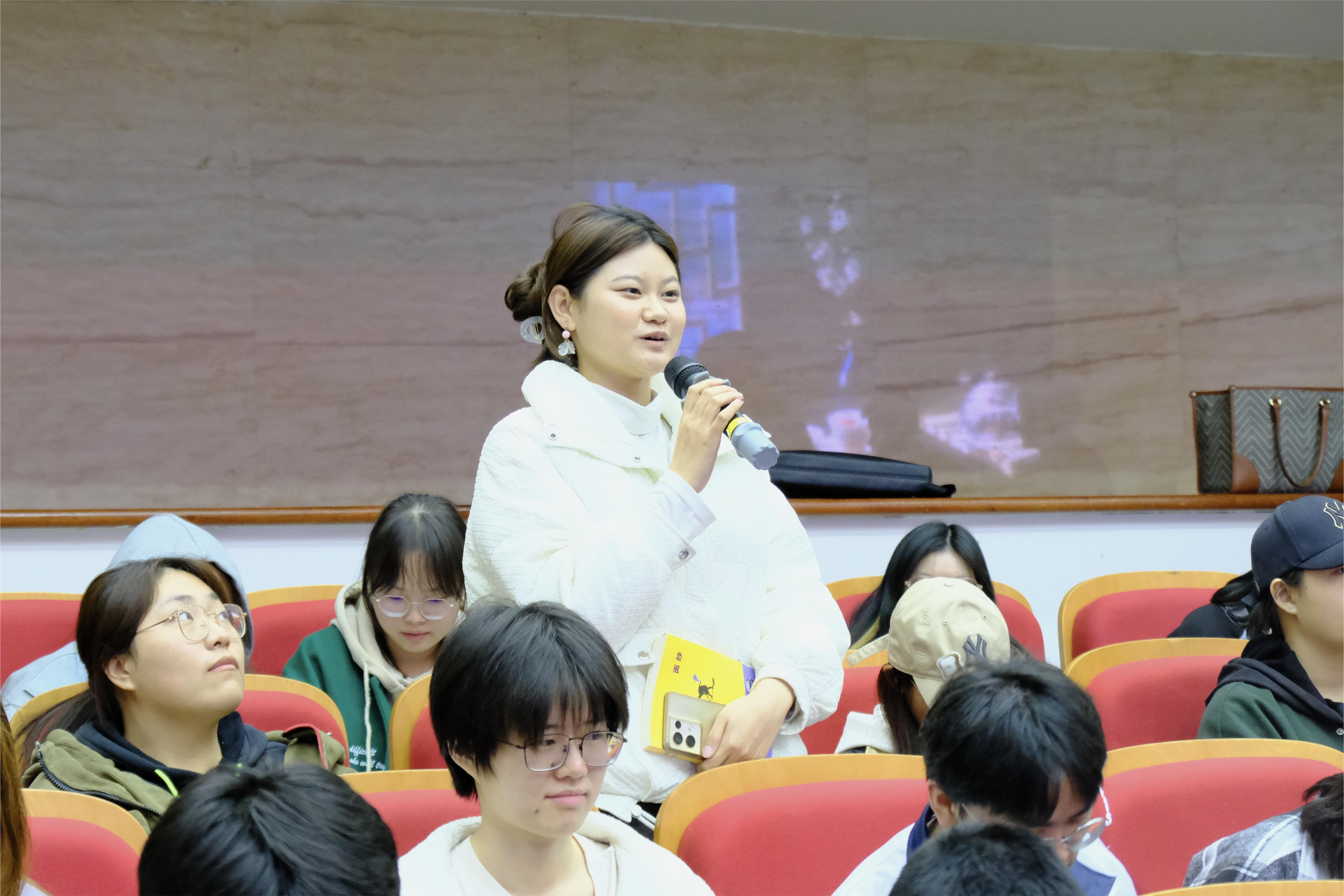 韓卓教授從心理學的角度深入剖析了焦慮和內耗背后的機制,并分享了一系列實用的方法和技巧,幫助學生們在日常生活中調節情緒、緩解壓力。她建議大家可以從情景導向、認知導向和反應導向三個層面上調節情緒,通過自我憐憫練習等方式,感受和理解自己的痛苦,向自己和他人表達愛和接納,從而更好地改善情緒狀態。她強調,大家需要正確認識壓力,對自己的身心健康產生重要影響的不是壓力本身,而是對壓力的看法,即使是負面情緒也可能有積極的意義與功能。在交流環節中,學生們積極提問,韓教授耐心解答,現場氛圍熱烈而融洽。