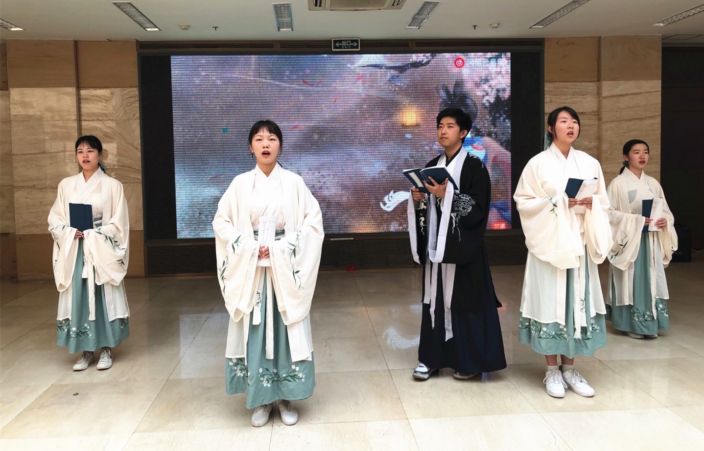 活動在圖書館小圖工作室學(xué)生們的經(jīng)典誦讀《墨梅》中拉開序幕,誦讀者們以充滿詩意的語言,飽含深情的朗誦,真摯表達了大學(xué)生對于閱讀的熱愛和感悟。第三屆朗讀者大賽一等獎得主趙亞欣同學(xué)帶來的朗讀《我愿意是激流》,語言豪邁,聲韻柔婉,激蕩著每一位觀眾的心靈。第二屆微書評大賽特等獎得主呂錦睿同學(xué)以一篇《三國,不只是大人物的舞臺,小人物同樣很精彩》為題的演說,聲音渾厚,氣勢恢宏,再現(xiàn)了傳統(tǒng)文化的經(jīng)典,也讓觀眾仿佛置身歷史現(xiàn)場與英雄產(chǎn)生共鳴。隨后,校學(xué)生會主席陸聰代表全校青年發(fā)起讀書倡議,讓閱讀無處不在,讓閱讀隨時發(fā)生,為人生精彩、學(xué)校發(fā)展、民族復(fù)興而讀書。
