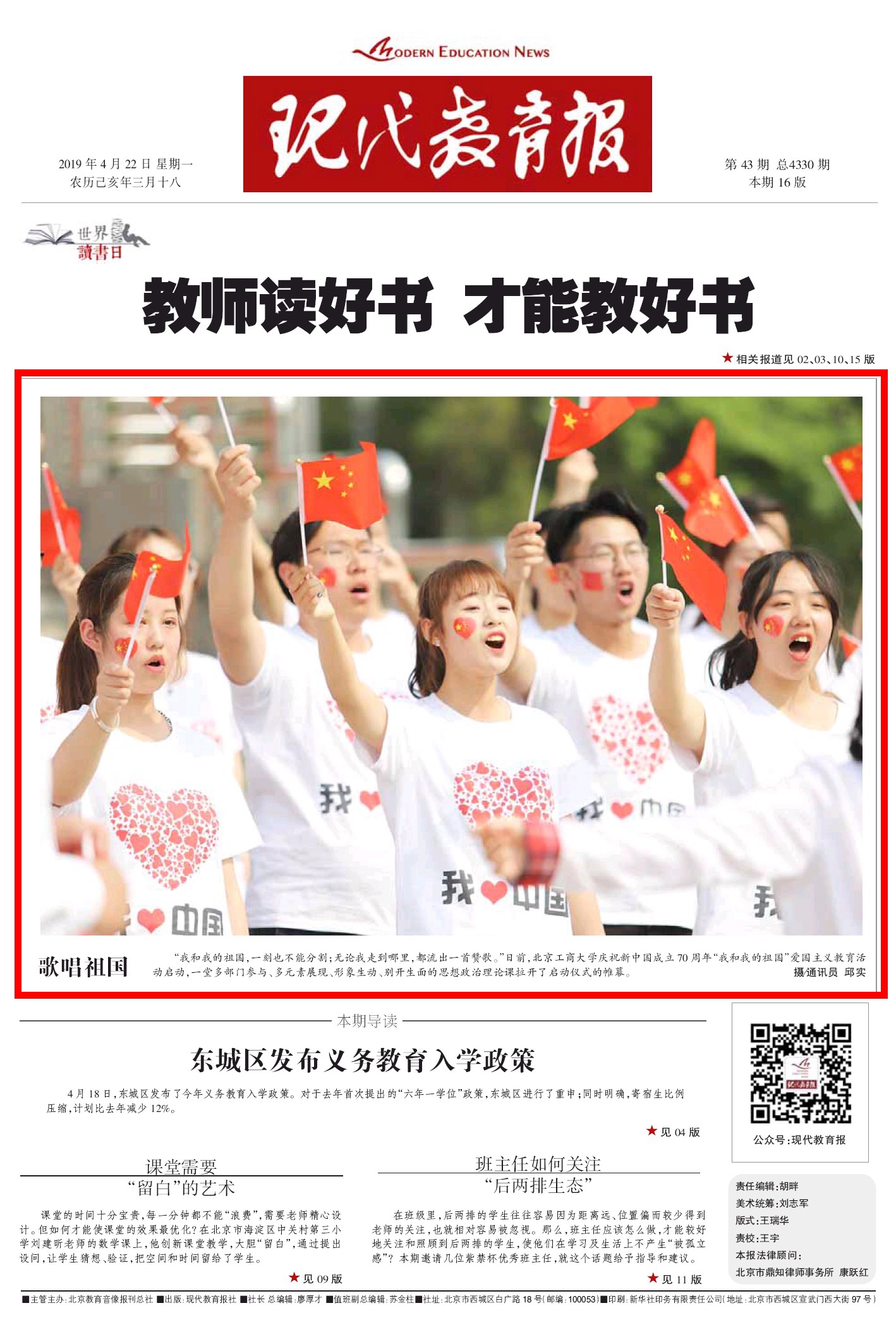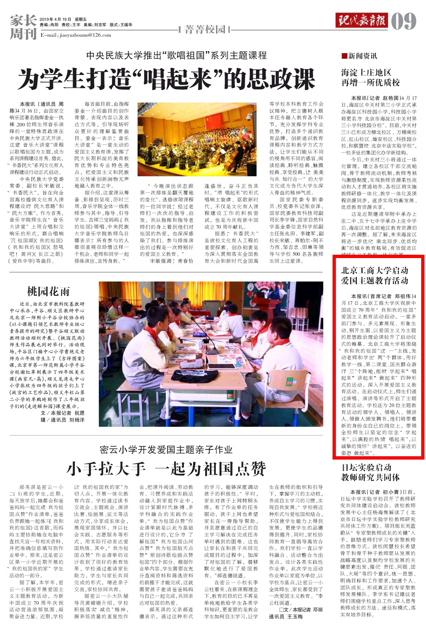 3.《現(xiàn)代教育報(bào)》4月22日第A1版報(bào)道:《歌唱祖國》