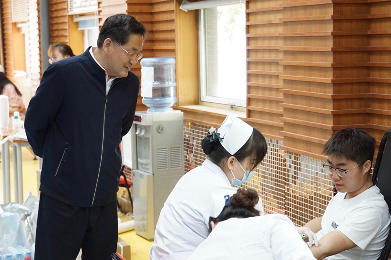 本次活動(dòng)受到學(xué)校、學(xué)院高度重視,學(xué)校黨委副書記張德玉到現(xiàn)場(chǎng)看望獻(xiàn)血師生和志愿者們,積極與獻(xiàn)血者們交流溝通,關(guān)心他們的身體狀況。同時(shí)也慰問(wèn)了在場(chǎng)的工作人員,對(duì)他們的工作表示滿意和感謝。學(xué)生處處長(zhǎng)呂素香也一同來(lái)到現(xiàn)場(chǎng),時(shí)刻關(guān)注同學(xué)們的情況,并提醒同學(xué)們獻(xiàn)血后要注意休息,避免劇烈活動(dòng)。
