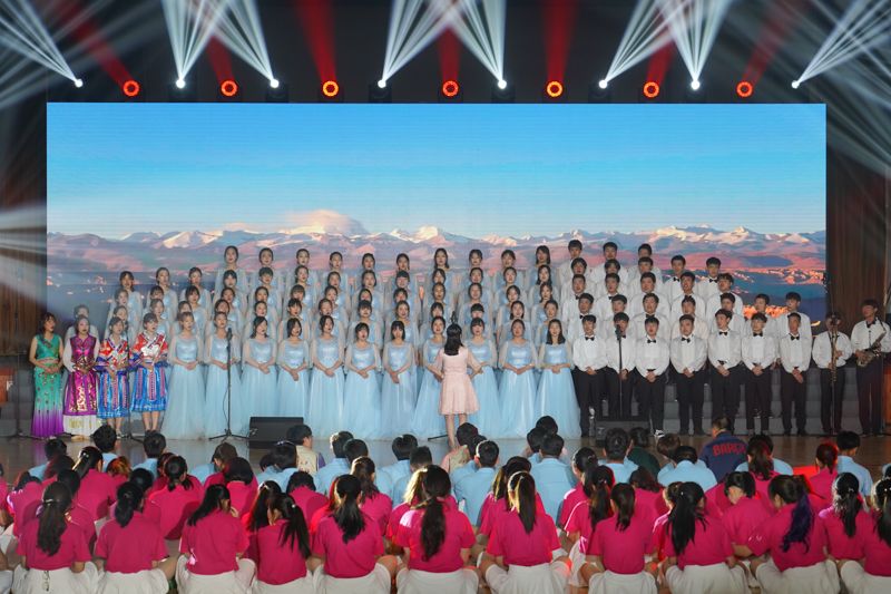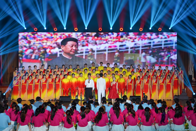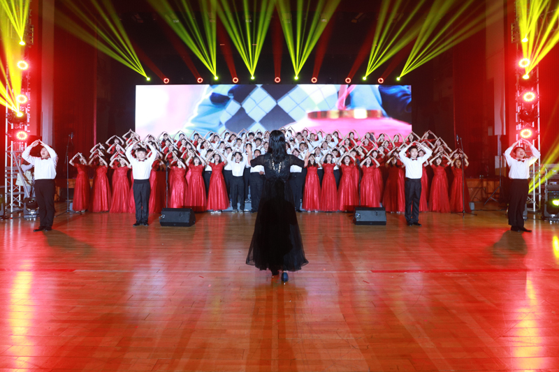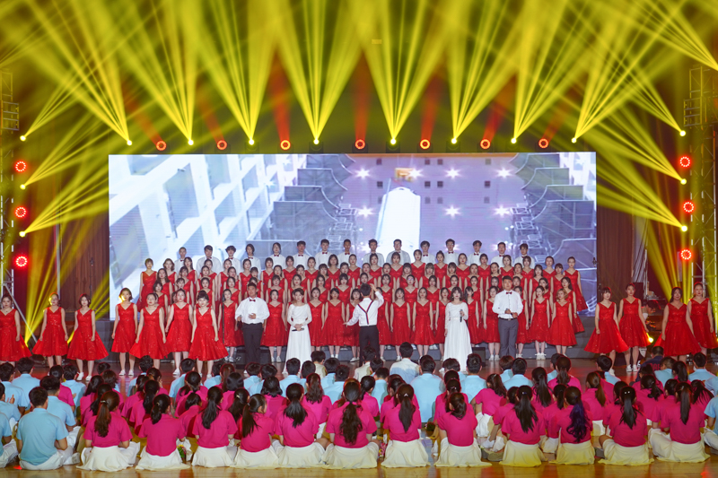 隨后,歌會(huì)進(jìn)入了下篇——新征程,回望歷史成就,踏向新征程。這一百年是奮斗的一百年,是進(jìn)取的一百年,我們的青年前仆后繼投入到建設(shè)國家的光榮道路上,一百年是個(gè)節(jié)點(diǎn),象征著我們的青年踏向了新的征程!理學(xué)院的《國家》《新的天地》蓬勃向上,飽含著青年學(xué)子對祖國新天地的向往和面對未來征程的必勝之心;計(jì)算機(jī)與信息工程學(xué)院的《我和我的祖國》《強(qiáng)國一代有我在》歌曲旋律優(yōu)美,磅礴大氣,充滿了活力與激情,機(jī)器人動(dòng)感的舞蹈配上同學(xué)們充滿活力的演繹,將活動(dòng)推向高潮;在簡潔快速的交換場地后,法學(xué)院激情獻(xiàn)唱的《紅旗飄飄》《邁向新征程》鏗鏘有力,慷慨激昂,為歌會(huì)帶來了精彩難忘的收官。