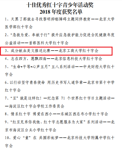日前,北京市紅十字會組織了全市紅十字青少年活動評選,來自全市各紅十字會推薦的121個項目參與評選。經(jīng)過兩輪評審,我校申報的《成分獻血美文推送比賽》獲評“十佳優(yōu)秀紅十字青少年活動”,成為獲得該獎項5所高校之一。我校紅十字會學生分會會長史磊同學榮獲“優(yōu)秀紅十字青少年會員”稱號。