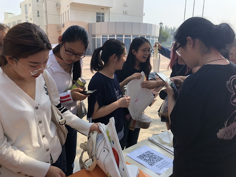 9月25日下午,阜成路校區教職工歌詠比賽結束后,老師們被志愿者繪制的精美布袋所吸引,紛紛領取布袋,現場氣氛熱烈而愉快。拿到志愿者們繪制的布袋后,老師們高度贊揚了大家的構思巧妙、畫工精湛,并與自己領取的布袋合影留念。馬克思主義學院袁雷老師表示,同學們制作得很精致,我們很喜歡這樣有創意的作品和活動。