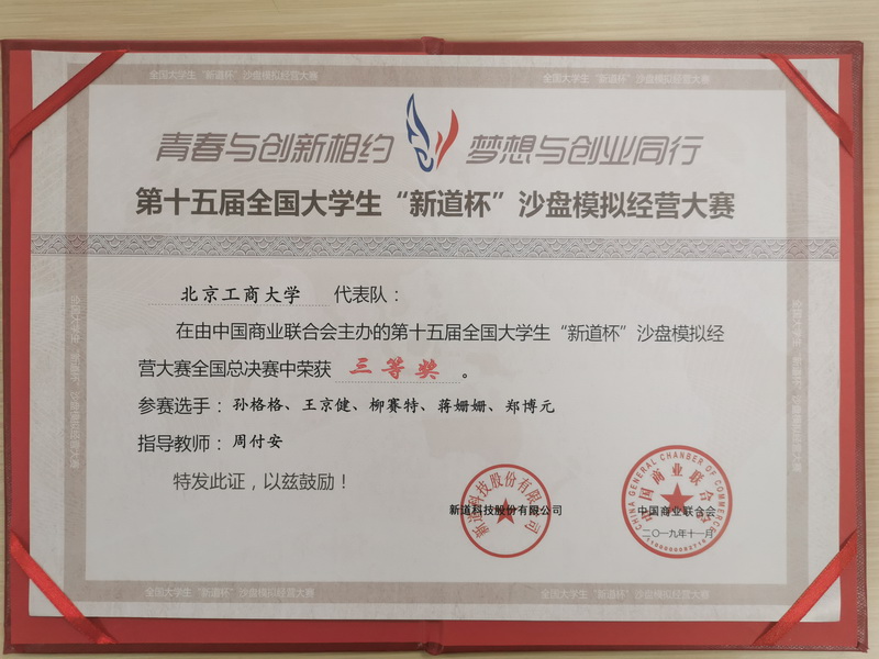 1115日至17日,由中國商業聯合會主辦,金陵科技學院承辦,新道科技有限公司提供技術支持的“第十五屆新道杯全國大學生企業模擬經營大賽(本科組)總決賽”在南京金陵科技學院舉行。來自全國30個省市自治區100多所高校的120支隊伍參加比賽。由我校經濟學院文科實踐中心組織,周付安、田芬老師指導的參賽代表隊榮獲了三等獎。