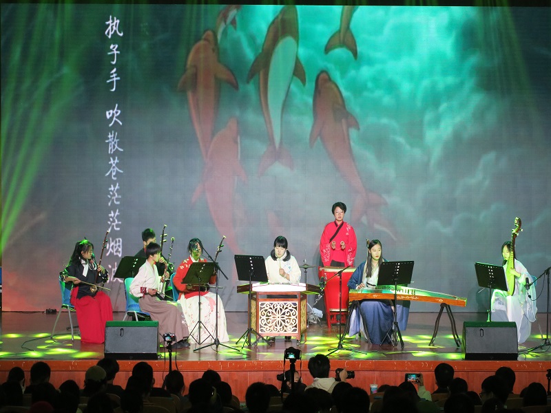 演出形式新穎,內(nèi)容豐富,融歌曲、舞蹈、武術(shù)、器樂(lè)等多種表演形式于一體,各學(xué)生社團(tuán)精心準(zhǔn)備,為在場(chǎng)觀眾獻(xiàn)上了一場(chǎng)視聽(tīng)盛宴。伴隨著悠揚(yáng)的樂(lè)曲,雪域鍋莊社的舞蹈《羌塘舞蹈》,盡情地展現(xiàn)著民族風(fēng)情;民樂(lè)團(tuán)帶來(lái)的《大魚(yú)》旋律悠遠(yuǎn)綿長(zhǎng),遼闊空靈,如詩(shī)一般深入人心;合唱團(tuán)用清麗的曲調(diào)動(dòng)情地吟唱《沒(méi)什么大不了》,彰顯青春與活力;GSMY街舞社的舞蹈《Heathens》火熱炫酷,點(diǎn)燃了現(xiàn)場(chǎng)的氣氛;武術(shù)協(xié)會(huì)《武動(dòng)乾坤》行云流水、剛勁有力,彰顯了武術(shù)的魅力;七音階國(guó)標(biāo)舞協(xié)會(huì)《七音之律》將技術(shù)動(dòng)作、樂(lè)曲旋律完美結(jié)合,生動(dòng)演繹了流暢優(yōu)美的國(guó)標(biāo)之韻;校園國(guó)防社帶來(lái)的情景表演《兵耀工商》,鏗鏘有力,步伐豪邁,動(dòng)作整齊劃一,展現(xiàn)出退伍大學(xué)生士兵的青春風(fēng)采,將現(xiàn)場(chǎng)氣氛推向新的高潮;知行魔術(shù)社表演的魔術(shù)小品《買(mǎi)橘子的小男孩》展示了魔術(shù)獨(dú)特的魅力,激發(fā)了觀眾們的無(wú)限遐想;最后,隨著一首旋律優(yōu)美、曲調(diào)溫婉的歌曲《手心的薔薇》,本次社團(tuán)文化節(jié)閉幕晚會(huì)圓滿結(jié)束。