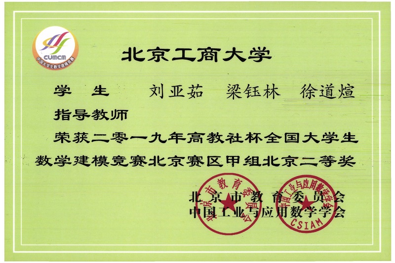 同時(shí),在剛剛公布的2019年高教社杯全國大學(xué)生數(shù)學(xué)建模競賽暨北京市大學(xué)生數(shù)學(xué)建模與計(jì)算機(jī)應(yīng)用競賽獲獎名單中,我校49支參賽隊(duì)伍經(jīng)過4天的緊張奮戰(zhàn),獲北京市二等獎5項(xiàng)。