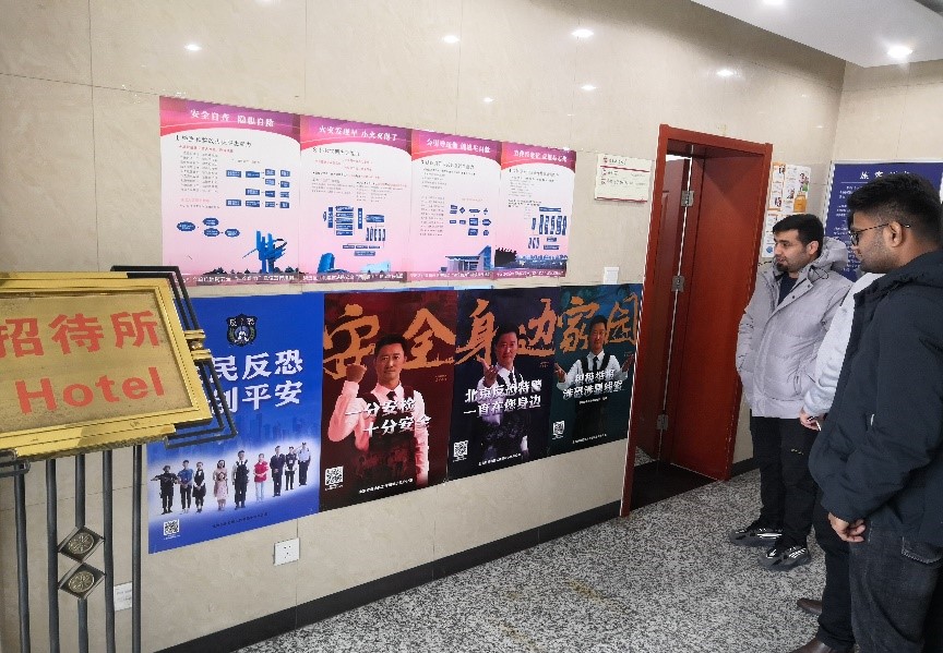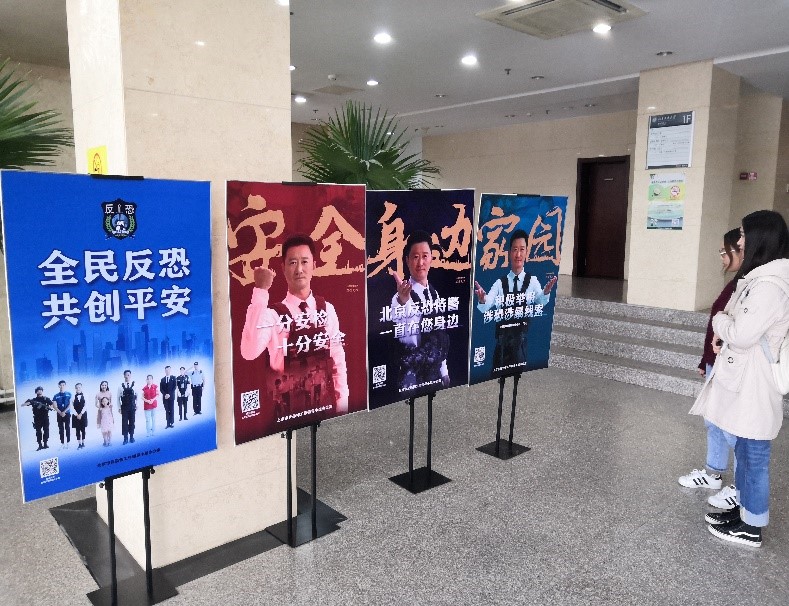 學生工作部通過各學院以班級或宿舍為單位,組織學生集中觀看、學習2019年官方反恐普法宣傳視頻,覆蓋人數6000余人次。研究生工作部組織學院各班級通過黨員小組討論會、主題班會集體討論、海報張貼、發放宣傳材料等形式,開展自學和集體學習,拓寬宣傳渠道,加大宣傳力度。法學院院召開《反恐怖主義法》學習交流座談會。學校團委在良鄉校區舉辦“全民反恐,共創平安”反恐普法宣傳教育活動。保衛工作部在兩校區懸掛橫幅,布置主題圖片宣傳展板,利用兩校區電子大屏滾動播放主題標語,在學校出入口、學生宿舍、食堂、招待所、教學樓等樓宇張貼反恐宣傳海報100余套。