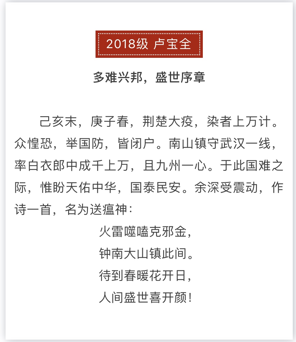 為傳遞“戰疫”正能量,北工商研究生會公眾號開設“不忘初心、共克時艱”研究生黨支部作品分享疫情防控宣傳欄目。各黨支部黨員紛紛用一幅幅書畫、海報、攝影、視頻等作品為武漢加油,為中國加油。從個人的角度上,同學們利用假期的時間,不斷提升自己的專業學習。輕工科學技術學院的丁佳瑩的分享——《疫情之下如何在家安心學習》,讓我們利用在家的時間來學習一些新的技能提高和充實自己。從家庭的角度上,同學們不僅積極向家人科普防疫知識,同時在家中陪伴父母做了一系列有意義的事情。來自食品與健康學院于青林,通過記述他家的抗議時光,表現了他們一家積極主動自我隔離的居家充實生活。在社會的角度上,作品更是展現了新時代青年的使命與擔當。材料與機械工程學院逆行而上,向陽而生抗疫小分隊的視頻——《愛因為在心中》,表現了青年學子跟武漢一起,眾志成城,抗擊疫情必勝的決心;來自經濟學院的李攀和身為黨員的媽媽一起當志愿者,幫忙排查、登記,積極投身于抗議的一線;來自商學院1934黨支部的公眾防疫宣傳,在社會間傳遞溫情;來自馬克思主義學院同學們的詩詞,展現了新時代青年對問題的思考與反思。
