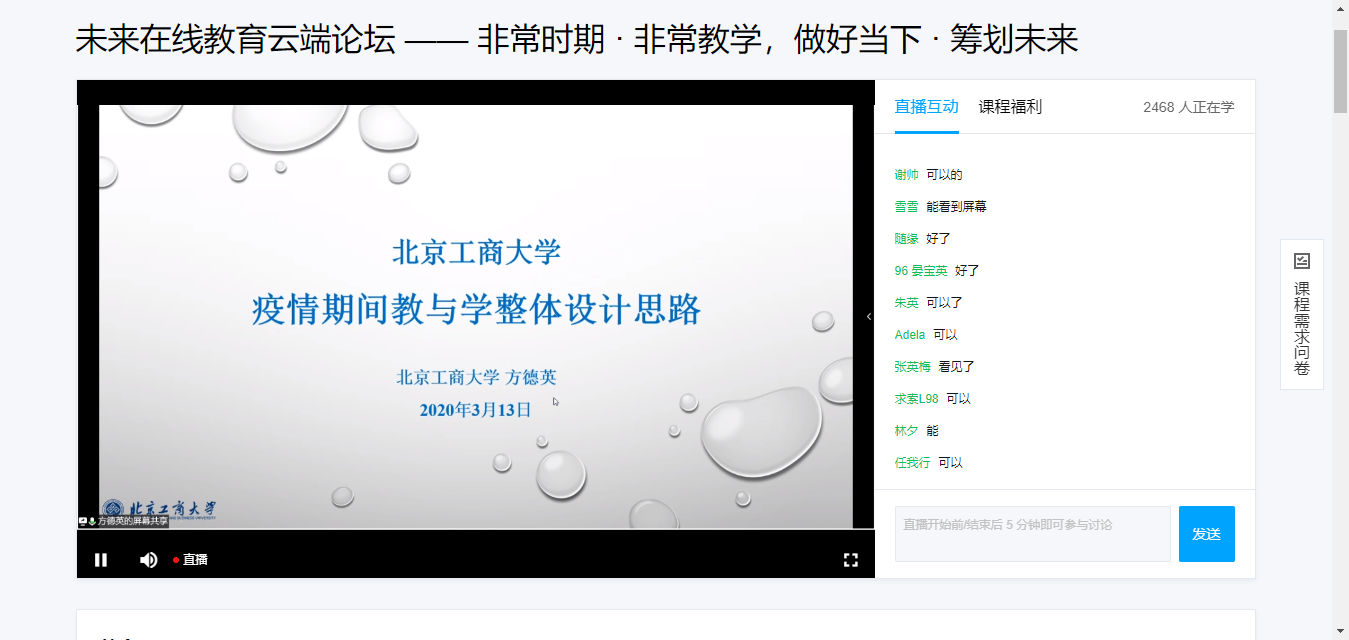 抗“疫”期間,全國各級各類教育工作者基于互聯(lián)網(wǎng)開展了形式多樣的教與學(xué)活動,北京師范大學(xué)未來教育高精尖創(chuàng)新中心聯(lián)合騰訊教育,以“非常時期·非常教學(xué),做好當(dāng)下·籌劃未來”為主題,舉辦了“未來在線教育云端論壇”,論壇邀請了全國頂尖的教育專家、校長代表和企業(yè)精英,采用網(wǎng)絡(luò)直播互動的形式,共同分析新時代在線教與學(xué)的實施路徑和方法,探討未來在線教育的發(fā)展方向。副校長方德英應(yīng)邀出席論壇。 3月14日,方德英副校長在論壇中做了題為《在線教與學(xué)高校之行-北京工商大學(xué)疫情期間教與學(xué)整體設(shè)計》的發(fā)言,從在線教與學(xué)整體設(shè)計原則、教學(xué)形式與方式的思考、當(dāng)前兩個方面的不足進(jìn)行分析闡述。他談到,在線教育應(yīng)以時空范圍內(nèi)優(yōu)化資源為本,充分利用信息技術(shù)將校內(nèi)校外、國內(nèi)國外,本碩博及繼續(xù)教育的資源打通,不斷完善教育管理體系,不僅將網(wǎng)絡(luò)教學(xué)作為應(yīng)對特殊時期教育的權(quán)宜之計,而是在促進(jìn)信息技術(shù)與教育教學(xué)的深度融合方面能有更深遠(yuǎn)的發(fā)展。 論壇分析盤點了全國在線教育發(fā)展的新態(tài)勢,研討如何基于互聯(lián)網(wǎng)開展更加高效、有價值的在線教育教學(xué)活動,并由此思考與凝練未來教育與未來學(xué)校的發(fā)展新思路,對做好當(dāng)前應(yīng)急服務(wù),并構(gòu)建學(xué)校教育與在線教育深度融合的新生態(tài)具有重要的意義。
