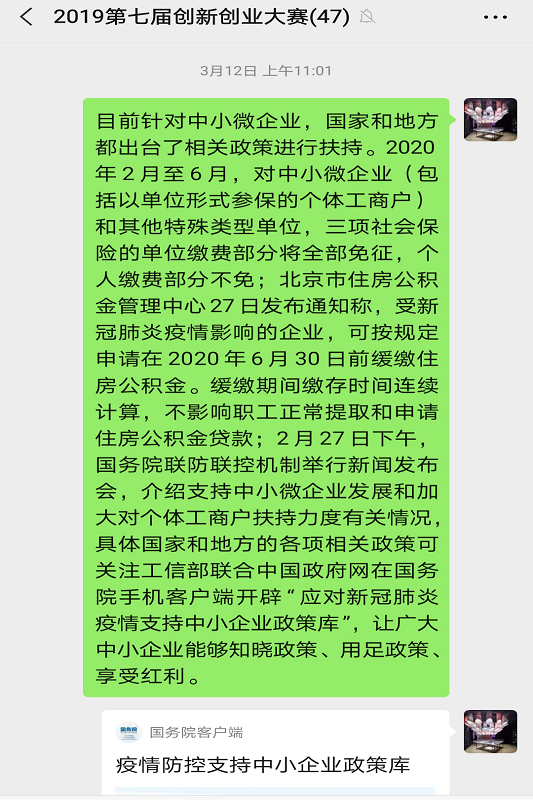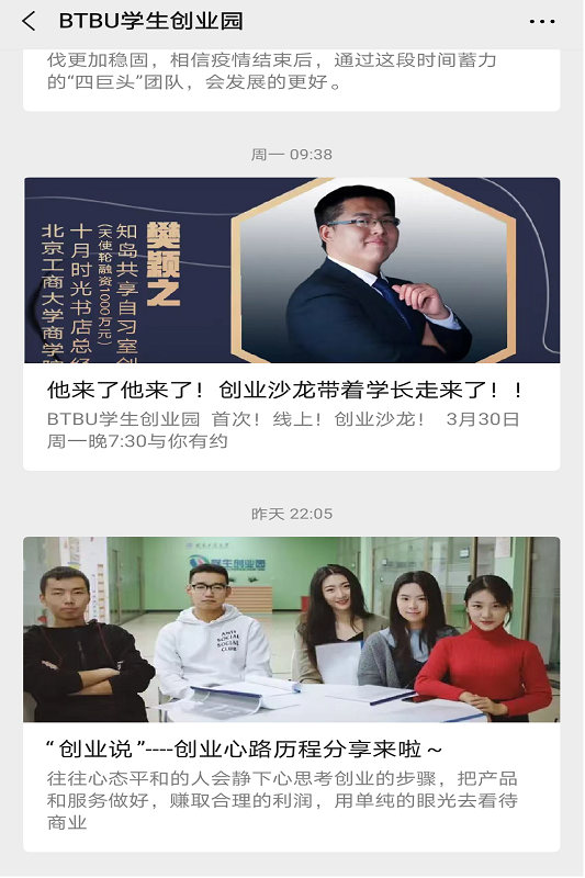 疫情期間,通過創(chuàng)業(yè)園微信群等方式積極與團隊溝通交流,線上調(diào)研同學(xué)們的相關(guān)需求,積極關(guān)懷在湖北的學(xué)生,積極搜集整理疫情下國家和北京市的創(chuàng)業(yè)支持政策,并開展了“創(chuàng)業(yè)說”---創(chuàng)業(yè)者心路歷程分享活動,采取線上公眾號推文的形式,將創(chuàng)業(yè)園優(yōu)秀入駐團隊負責(zé)人的創(chuàng)業(yè)心路歷程和經(jīng)驗分享給同學(xué)們,讓同學(xué)們了解大學(xué)生創(chuàng)業(yè)的歷程,從文字中體會創(chuàng)業(yè)者的創(chuàng)新與拼搏精神。