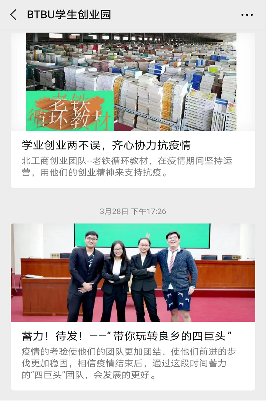 此外,還開展了疫情期間在符合國家防疫規(guī)定的前提下有序運行項目的創(chuàng)業(yè)團隊風(fēng)采展示活動,積極與相關(guān)團隊溝通,收集相關(guān)素材,目前已推送了“學(xué)業(yè)創(chuàng)業(yè)兩不誤,齊心協(xié)力抗疫情”和“蓄力!待發(fā)!--帶你玩轉(zhuǎn)良鄉(xiāng)的四巨頭”兩支團隊的相關(guān)內(nèi)容。
