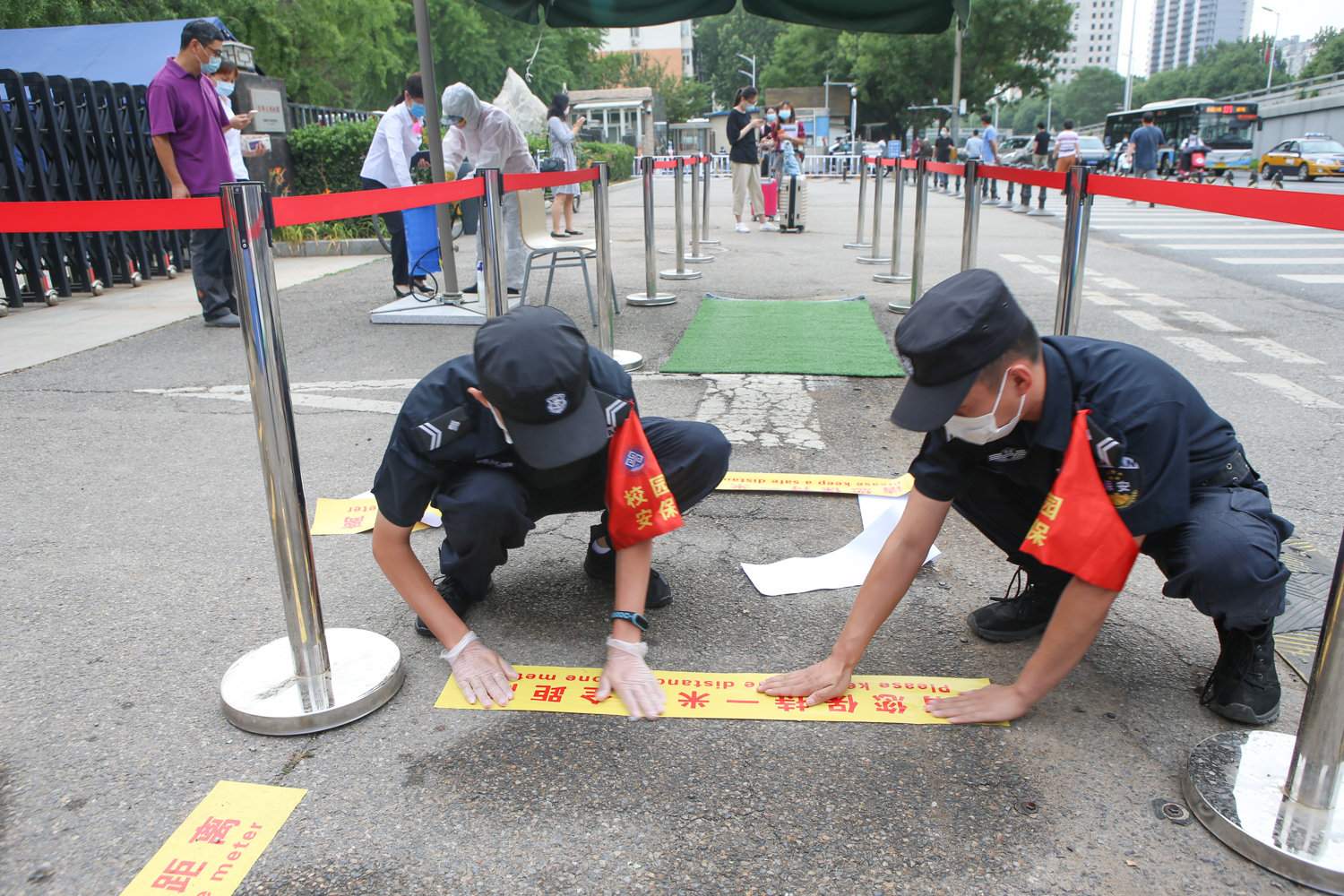 在學校阜成路西區南門、東區南門,保衛處加強校園和大門管控,實施人員進出分流,采用非接觸式熱感應測溫設備,提高人員入校速度。返校畢業生排隊等待入校,每位學生經過行李消殺、身份核驗、體溫初篩后入校。