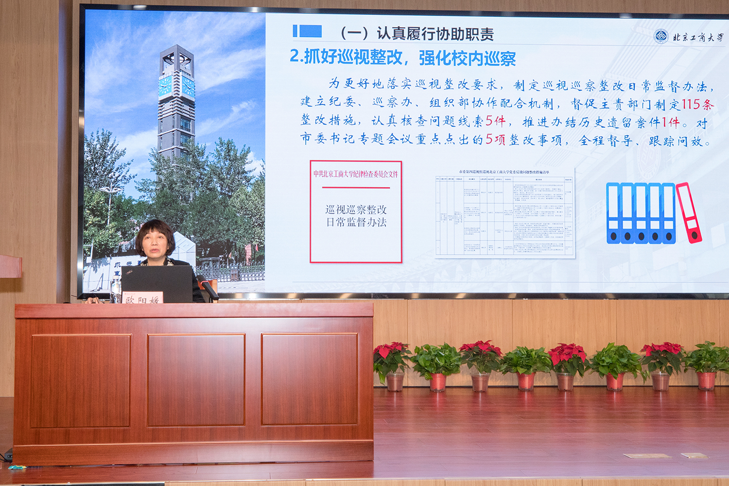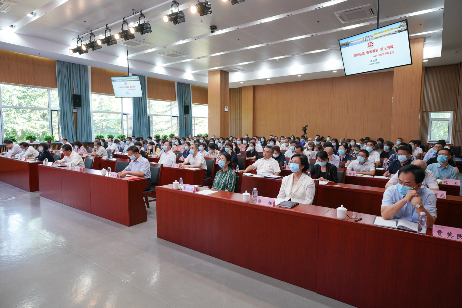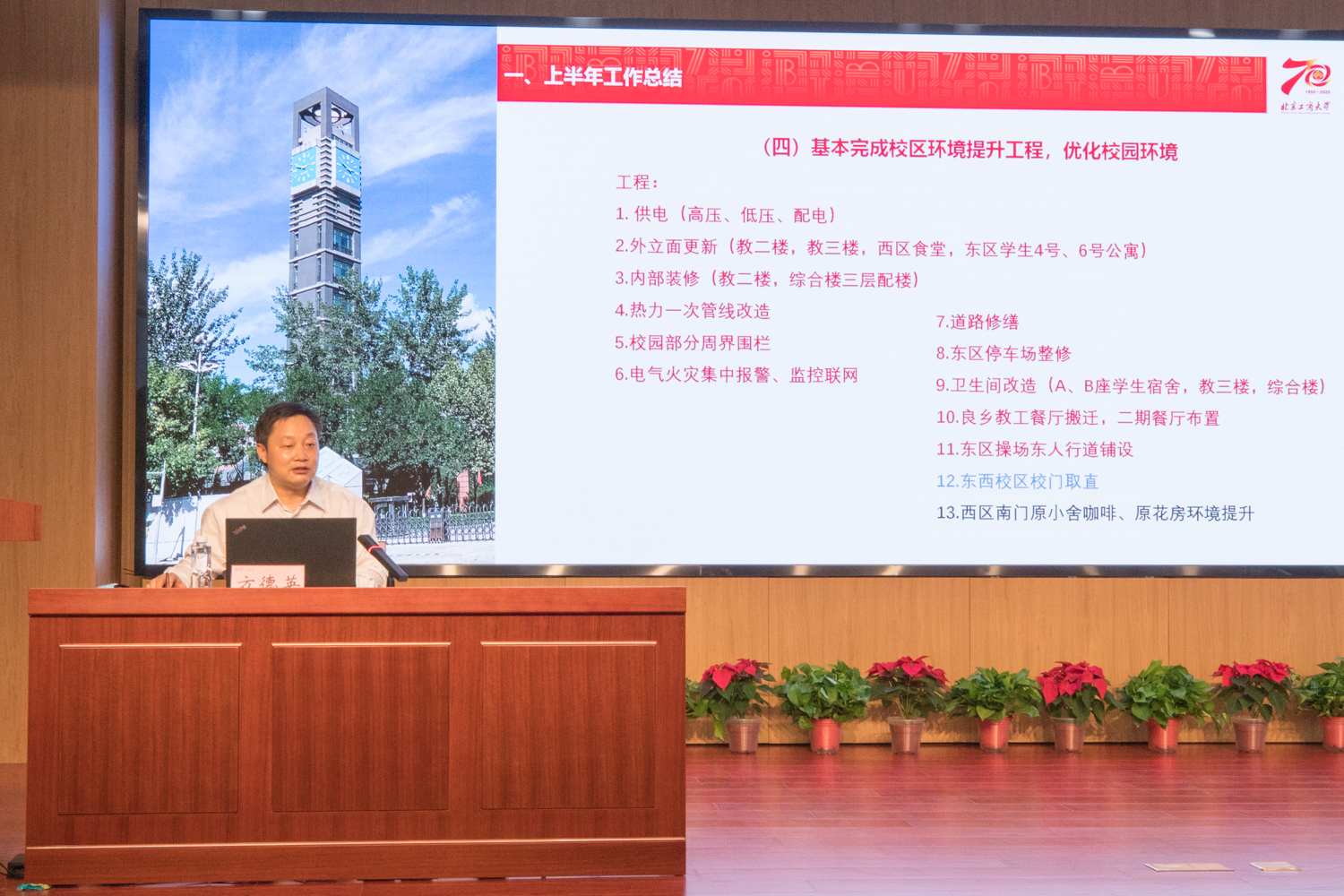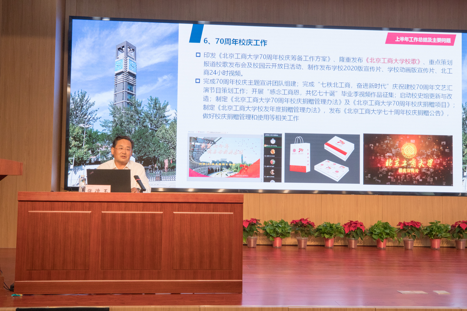 孫寶國校長回顧總結(jié)了上半年在黨中央和市委市政府的堅強領導下,全體北工商師生員工眾志成城、齊心協(xié)力抗擊新冠肺炎疫情,穩(wěn)步推進各項工作取得的突出成效:一是疫情防控工作取得階段性勝利,全體師生員工零感染;二是多措并舉確保線上教學有序運行,圓滿完成了上學期的教學任務;三是“以學生為本”,高效、周到完成畢業(yè)生畢業(yè)離校工作,教職工親手打包3萬余件行李并完成寄送,感動師生,引起社會良好反響;四是在做好疫情防控工作前提下,采取有效措施確保良鄉(xiāng)校區(qū)二期建設和阜成路校區(qū)環(huán)境提升工程按期按計劃完成,為新學期開學做好條件保障。孫寶國校長重點解讀了北京市分類辦學高水平研究型大學績效考核標準,深刻剖析了學校在人才培養(yǎng)、學科建設、科學研究等方面存在的差距,要求全體教職工統(tǒng)一思想、統(tǒng)一認識、統(tǒng)一行動,圍繞建設高水平研究型大學一條主線,堅定不移地走內(nèi)涵式高質(zhì)量發(fā)展道路。孫寶國校長強調(diào),要找準與兄弟院校差距,補齊各領域短板,確立目標找準發(fā)力點,持續(xù)推進“369”和“421”等標志性指標,勇攀人才培養(yǎng)質(zhì)量、本科生深造數(shù)量、學科建設水平、科學研究質(zhì)量高峰。