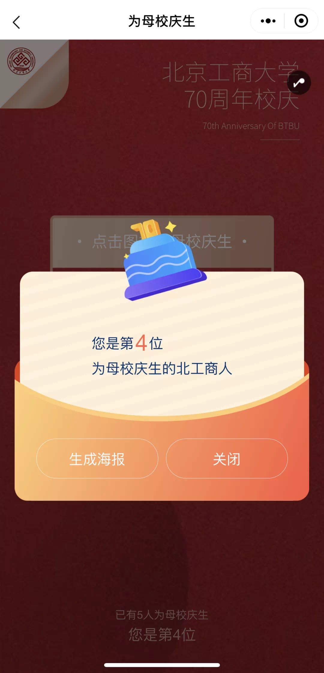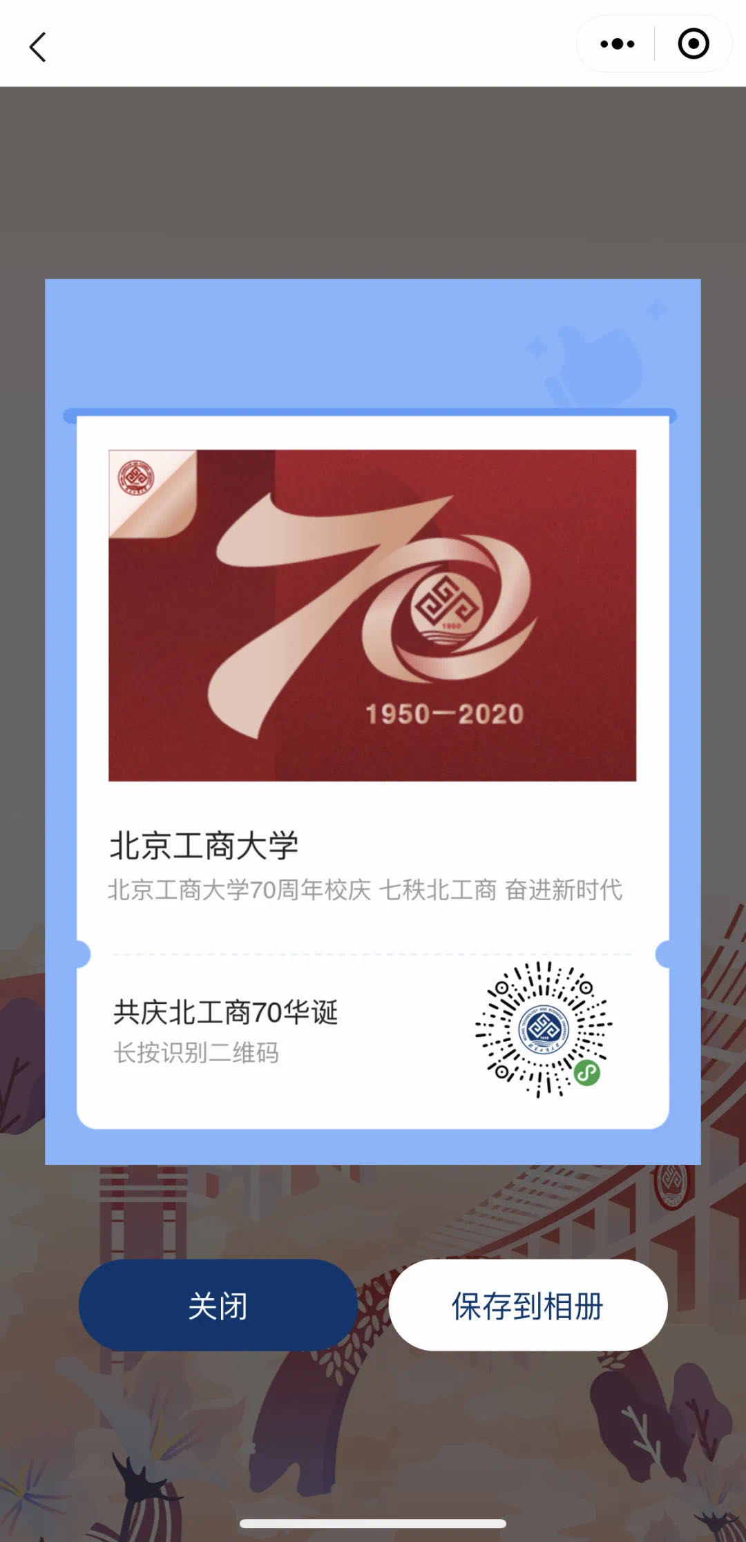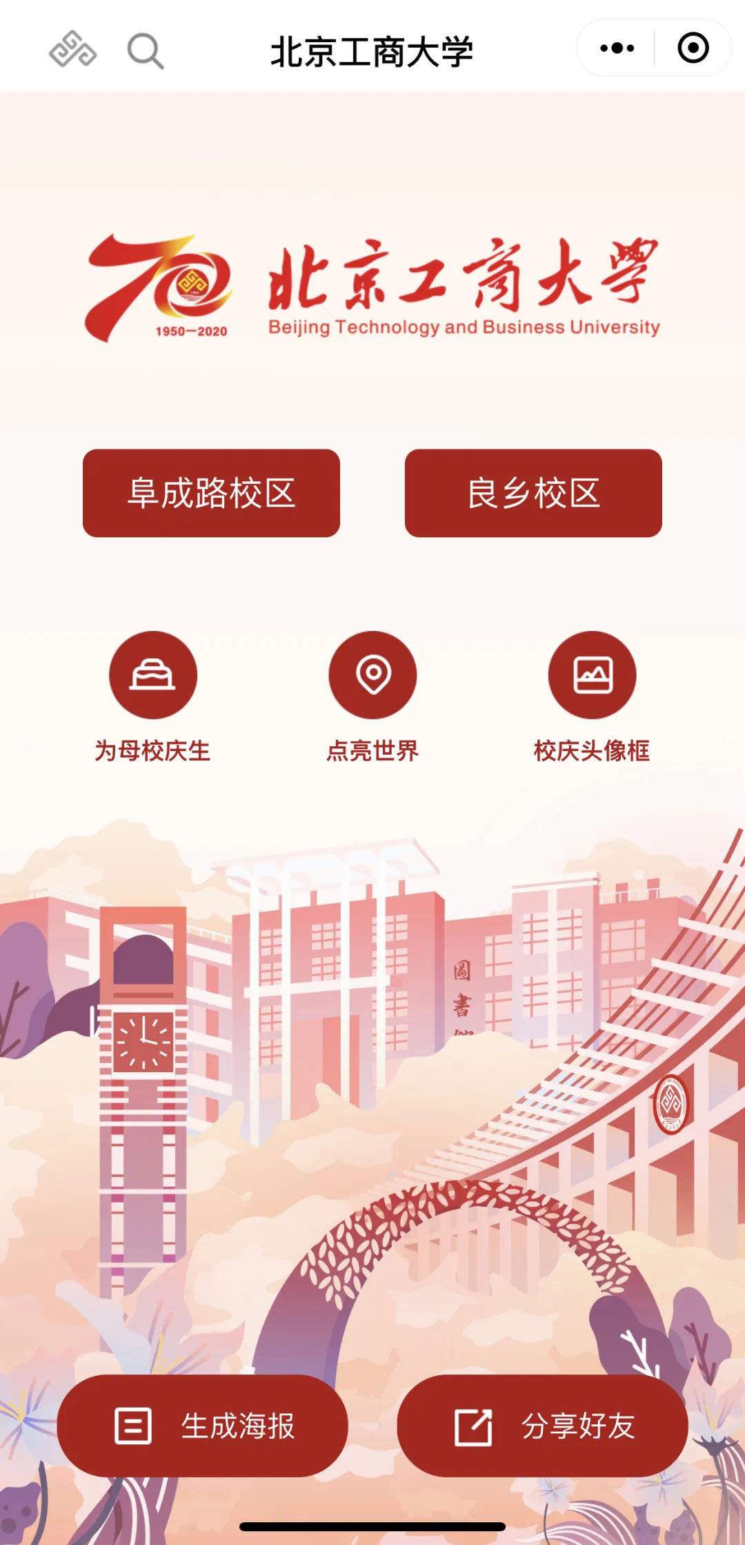 學(xué)校建校70周年校慶小程序,由黨委宣傳部、信息網(wǎng)絡(luò)中心聯(lián)合騰訊云共同研發(fā),內(nèi)含校園導(dǎo)覽(阜成路校區(qū)、良鄉(xiāng)校區(qū)全景手繪地圖)和應(yīng)用小程序(為母校慶生、點亮世界、校慶頭像框)等內(nèi)容 。