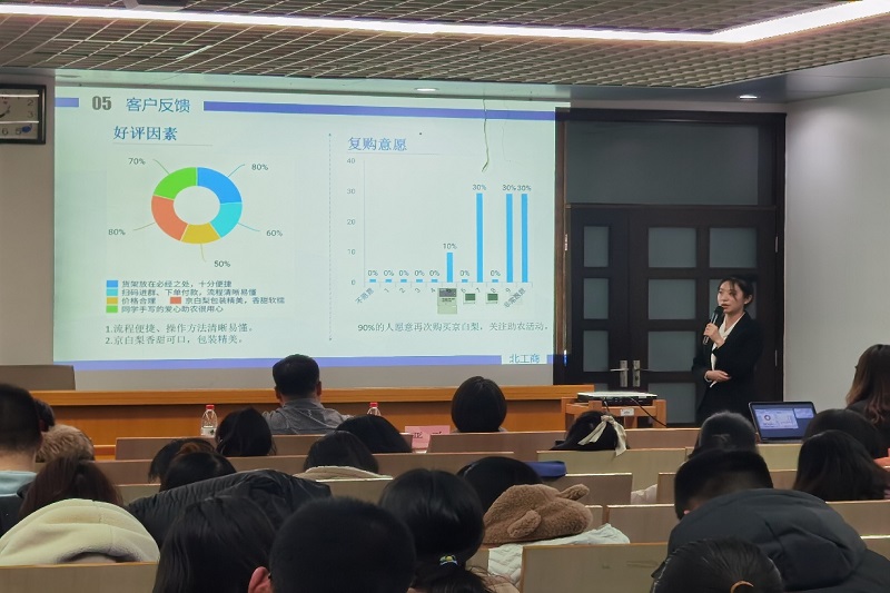 12月1日,大賽答辯會在良鄉(xiāng)校區(qū)舉行。答辯會現(xiàn)場,各小組代表依次登臺,多元化展示了本小組在大賽各個階段的表現(xiàn)和成果,專業(yè)評審老師根據(jù)各組展示情況進行了有針對性的提問。綜合答辯會現(xiàn)場師生評委的打分情況,與之前策劃方案賽、銷售賽分數(shù)進行加總,最終“賣梨的小姑娘”組獲得本次營銷策劃大賽一等獎。“白梨年華”、“七梨”兩個小組獲得二等獎,“梨中梨”“我們不分梨”“保二爭一”三個小組獲得三等獎。