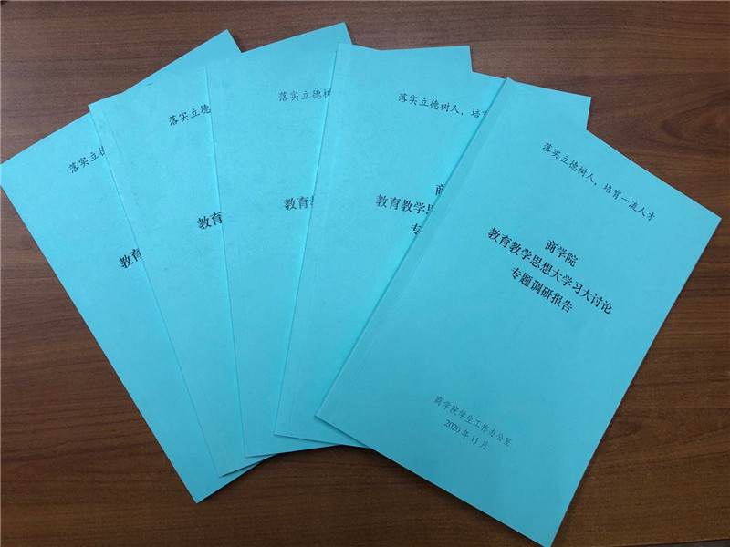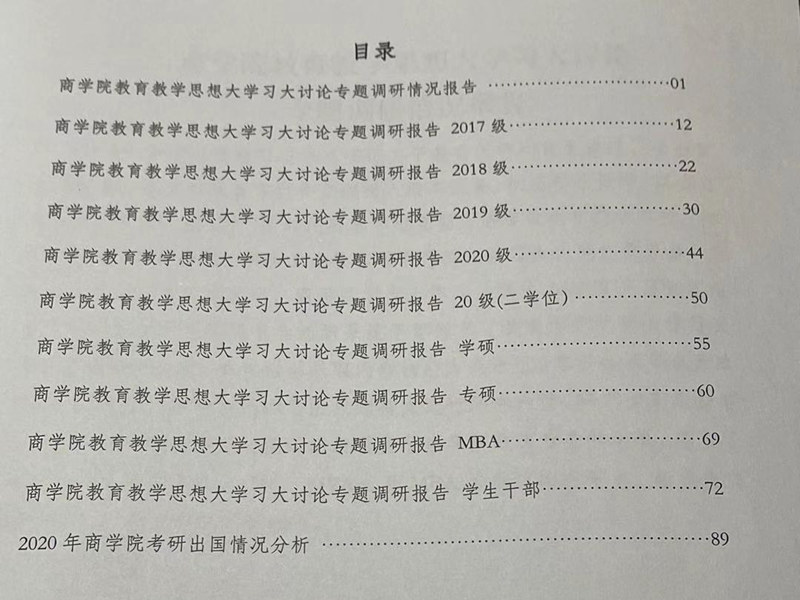 商學院學生工作辦公室于9月初面向全院本科生、研究生及學生組織系統干部開展了教育教學思想大學習大討論專題調研活動,采取問卷調研方式進行,根據各年級、各類型學生及團學干部的特點,共設計9類問卷,調研對象覆蓋了商學院所有專業和班級,從未來規劃、就業意向、思想動態、學風建設、學校制度等方面開展,其中本科生參與調研率為99.79%,研究生參與調研率66.58%,團學干部參與調研率100%。根據問卷調研情況,商學院學生工作辦公室針對發現的問題進行了系統分析,總結撰寫了1個總報告、9個專題調研報告,并針對2020屆畢業生升學情況撰寫了分析報告,共11個報告、約3.3萬余字,集結成冊。