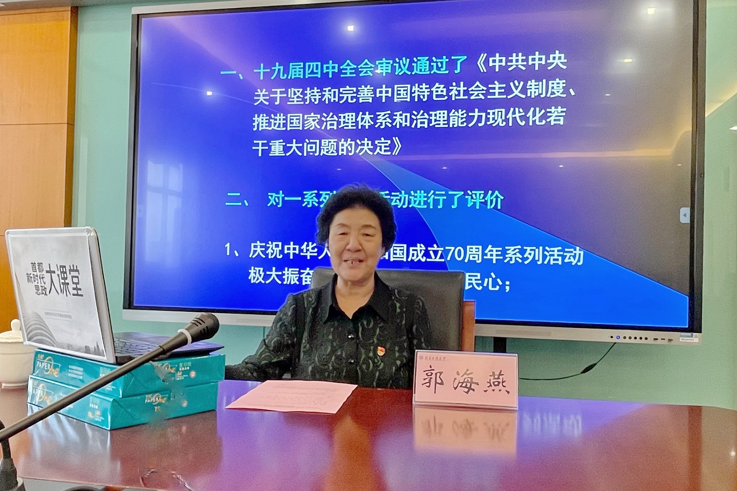 開班儀式后,中共北京市委講師團(tuán)專家團(tuán)成員、北京高校十九大精神宣講團(tuán)成員、首都師范大學(xué)郭海燕教授為同學(xué)們作了題為《增強(qiáng)制度自信,做中國特色社會(huì)主義制度的堅(jiān)定捍衛(wèi)者》的報(bào)告。郭海燕從國防建設(shè)、航空航天、抗震救災(zāi)、疫情防控等重大歷史事實(shí)出發(fā),通過中外對(duì)比和歷史分析,生動(dòng)闡釋了中國共產(chǎn)黨強(qiáng)有力的領(lǐng)導(dǎo)和中國特色社會(huì)主義制度的巨大優(yōu)越性。通過此次講座,各位學(xué)員對(duì)客觀事實(shí)和制度優(yōu)勢間的必然聯(lián)系有了更為透徹的理解,從而進(jìn)一步增強(qiáng)了“四個(gè)自信”,堅(jiān)定了入黨決心。