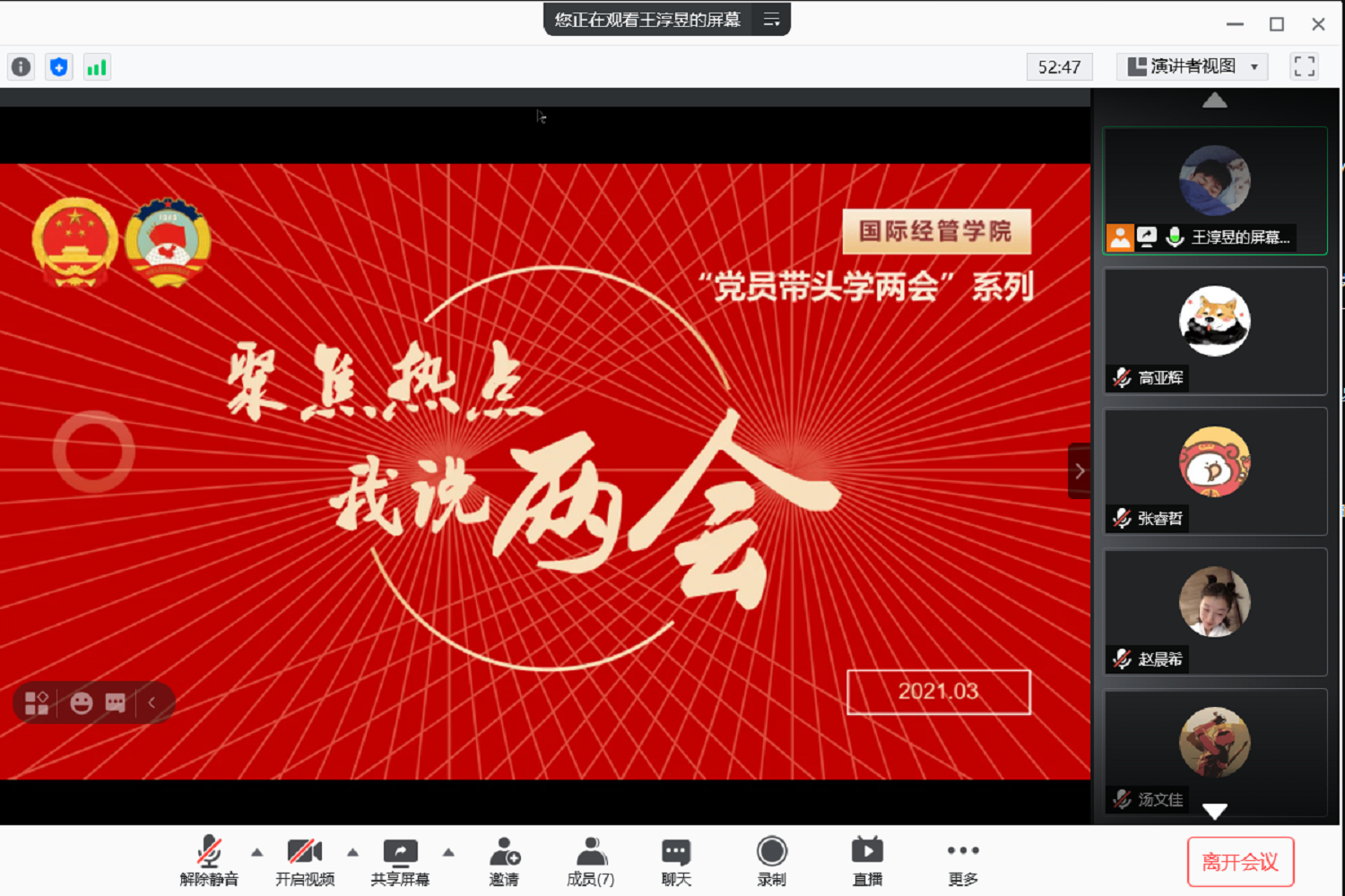 國際經管學院組織開展“領航學習”交流會、“聚焦熱點,我說兩會”等特色活動。殷媛媛將鄉村旅游與國際旅游管理專業聯系起來,提出“一村一品”理念,提升旅游品質,打造文化鄉村;楊嘉伊、李杜白結合大數據管理與應用專業,談到“十四五”期間數字化經濟的發展趨勢以及自己的努力方向。外國語學院學生黨員則發揮專業特色優勢,以“‘三語’話兩會,奮進新征程”為主題,用中、英、西三種語言講述與兩會相關的中國故事,解讀兩會政策,傳播中國聲音。