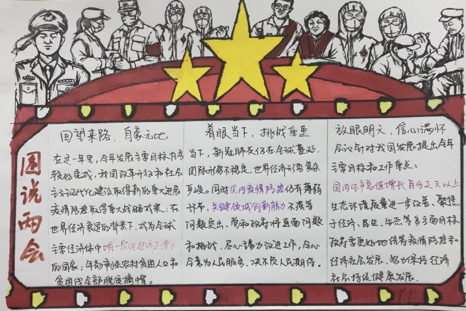 在學習過程中,部分學生黨員利用特長優勢,以手抄報、海報、思維導圖等形式,或將“兩會”內容歸納總結、清晰呈現;或抓住一兩個要素進行精心設計,讓人眼前一亮。