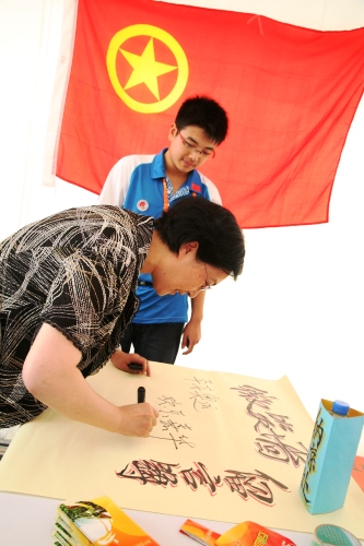 在雕塑園站點(diǎn),張校長(zhǎng)在留言簿上寫(xiě)下了“平安奧運(yùn),歡樂(lè)嘉華”八個(gè)字,表達(dá)了對(duì)奧運(yùn)的祝福和對(duì)嘉華學(xué)院學(xué)生的要求。
