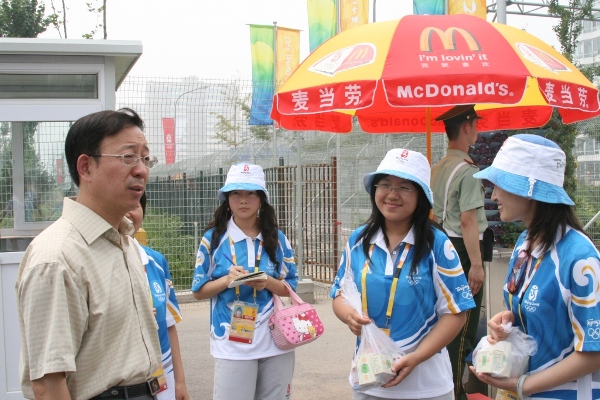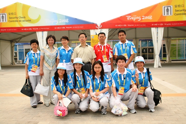 隨后,孫寶國一行依次來到奧運村的三號門、四號門和一號門看望正在烈日下工作的志愿者們。當聽說志愿者們每天必須在太陽下工作8個小時左右,而這其中有半數(shù)以上是女生,孫寶國特別強調(diào)要志愿者注意保持身體健康,保障基本的飲水和休息,還特別叮囑志愿者要服用鹽水,最好不要使用藥物。在三號門,孫寶國了解到帶隊老師楊帥能夠在完成自身工作之余,與志愿者們一同在烈日下站崗,表示了由衷的贊賞。他還詢問了志愿者工作中存在的問題,并跟志愿者們說要向一起工作的交警們學習。在歡迎中心和訪客中心,志愿者們邀請孫寶國一行與大家合影留念,在了解到這些志愿者主要任務是語言服務后,他表示這是一個鍛煉自己溝通能力的好機會,希望大家能夠借此機會多向他人學習。