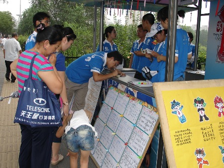 中央電視塔東倚玉淵潭,南靠北京西站,北望頤和園,是奧運期間重要的旅游景點和交通樞紐,這里人流量大,對崗位設在這里的化工學院城市志愿者的工作是一個較大的挑戰(zhàn)。城市志愿者一個很重要的工作內(nèi)容就是道路的指引,央視塔站點不時會遇到從外地來詢問路線的游客,“去玉淵潭西門怎么走?”“去鳥巢怎么坐車最方便?”“奧運專線都經(jīng)過哪里?”……志愿者們總是面帶微笑、不厭其煩地為他們講解、指路。為了方便路人,他們利用休息時間制作了奧運交通手冊、奧運場館指南、公交路線展板和央視塔周邊景點介紹展板。此外,志愿者們還想出了一個“便簽”服務的新點子。他們把路線詳細地寫在便簽上遞到問路人手里,極大的方便了行人。