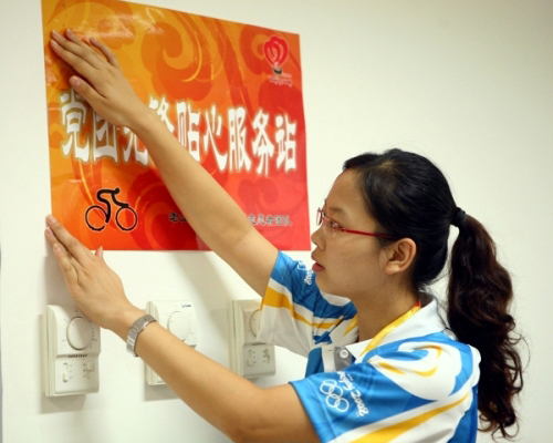 8月1日,志愿者團隊運行組志愿者在卜曉媛老師的帶領下開始裝飾志愿者之家。志愿者之家內部被劃分為“黨團先鋒貼心驛站”、“輕松驛站”、“學習園地”、“信息傳輸站”四個板塊,這樣可以使志愿者休息、娛樂、學習互不干擾。目前,老山自行車場館群團隊——志愿者之家組織管理辦法、老山自行車場館群團隊——志愿者之家管理條例、各板塊標識、微笑墻、涂鴉板等已被粘貼到位,液晶電視在前段時間已被放置到輕松驛站區。