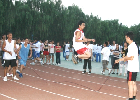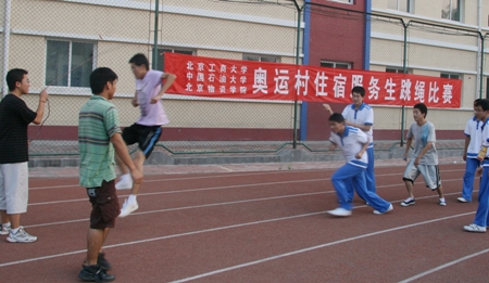 7點鐘比賽準時開始,北京工商大學(xué)一隊和物資學(xué)院一隊率先開始第一輪角逐,兩隊不約而同地選擇了循環(huán)“8”型的隊形。跑起來銜接的很緊湊,而且還省力有序,總體運行效果明顯高效。只見繩子有節(jié)律地搖動成一個均勻的弧圈,隊員們個個身手敏捷,前前后后,先后跳進跳出,男生女生配合默契,步調(diào)一致,快速而又流暢。同學(xué)們不顧一天的疲勞,下了班就跑到操場投入到磨合訓(xùn)練中。比賽中雖然有不熟練的地方而偶發(fā)失誤,但同學(xué)們早已把比賽結(jié)果跑到了九霄云外。場上場下歡騰一片,眼鏡被繩子打掉了,身體被纏住了,沒有人去在意喊疼,依然神情專注地來回穿梭;場下拉拉隊師生的歡呼聲、吶喊聲、叫好聲此起彼伏,大家臉上洋溢著微笑,一天的勞頓在這場輕松愉悅的活動中得到了充分的釋放。帶隊老師也加入其中,與同學(xué)們一道在繩間穿梭,藍色工裝和紅色工裝的搭配顯示出我們奧運村住宿服務(wù)團隊的和諧。事實證明,我們的住宿服務(wù)團隊不僅在業(yè)務(wù)上很有戰(zhàn)斗力,而且在業(yè)余文體活動中也是配合得當、協(xié)調(diào)有力。