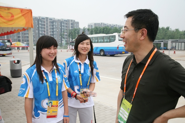 下午三點,王副校長一行到達奧運村,首先前往歡迎中心和訪客中心慰問了交通信息臺的志愿者,王副校長與志愿者們熱情握手。隨后,王副校長經過國際區(qū),在運動員班車站慰問了在崗的三名志愿者并親手將防曬霜贈與她們。當看到被太陽曬得膚色黝黑的志愿者時,王副校長親切地說:“你們辛苦了,我來的次數很少,沒法替你們站崗。”他還囑咐志愿者有什么需要盡