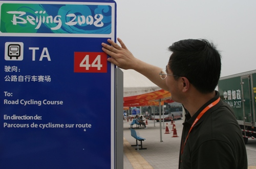 經(jīng)過近一周的協(xié)調(diào)和準(zhǔn)備,我校奧運(yùn)村志愿者的建議得到了奧運(yùn)村上級領(lǐng)導(dǎo)的高度肯定,目前,我校志愿者提出的三項建議完全得到了落實(shí),所申請的站位號標(biāo)示牌已全部制作完成。8月6日,班車站喜迎第一批標(biāo)示牌。剛粘貼好的指示牌鮮艷的標(biāo)識在陽光下顯得格外醒目,成為了班車站一道亮麗的風(fēng)景。同時,受站位號標(biāo)示牌的啟示,我校奧運(yùn)村志愿者建議的74條公交線路的分區(qū)箭頭也矗立在運(yùn)動員班車站的入口,運(yùn)動員班車站的大門口一塊標(biāo)有奧運(yùn)村運(yùn)動員班車站的大表示牌也于近日到位。這樣,運(yùn)動員們看到醒目的標(biāo)示完全可以方便地尋找車輛,在停車場工作的志愿者也表示這個小小的標(biāo)志大大減輕了他們的工作負(fù)擔(dān)。